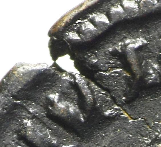 Probabilmente l'esempio che ho inserito sopra non è evidentissimo ma purtroppo non ho tanti esempi migliori...provo ad inserire una nuova foto (moneta differente) molto ingrandita dove si vede bene la stessa frattura visibile sia al Dritto sia al Rovescio.