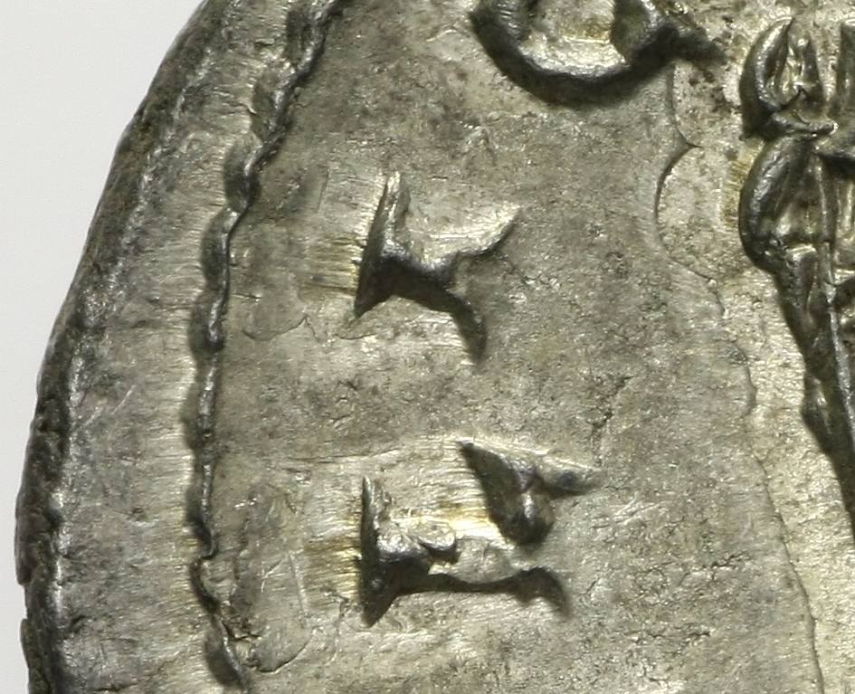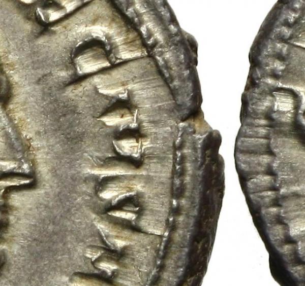 Per completezza ti allego l'ingrandimento del particolare di un antoniniano su cui puoi vedere bene i segni evidenti della coniazione e un esempio di frattura del tondello.