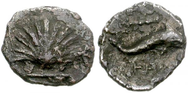 Mi sembra che nessuno abbia notato che alcuni oboli (detti anche litre) con i tipi Pecten/Delfino, come quelli sopra elencati possono essere attribuiti ad Herakleia invece che a Tarentum.