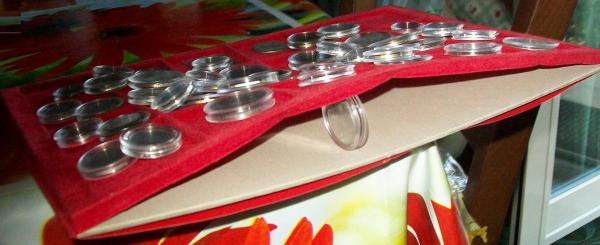 La soluzione che proponevo non mi pare fuori dal mondo (prima il cartellino, poi il velluto, poi la moneta ): nei vassoi di vecchi monetieri, in massello da mezzo cm, spesso si trova questa soluzione. perché non ti piace? e soprattutto: in cosa mi sbaglio?