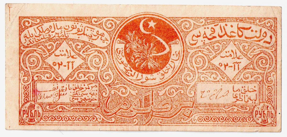 Nel 1922 infine cambia tutto, si abbandonano gli stampini "pre-gutemberghiani", qualcuno rimedia una macchina da stampa ed il risultato é... molto più banale! A titolo di esempio la banconota da un rublo (ce ne sono anche di policrome, soprattutto nei valori "alti", ma il genere é questo). Da notare il nuovo simbolo della repubblica, una ripresa di quello del 1920 integrato con mezza luna e stella. Carta filigranata con valori a capocchia (ma era cosi' anche nelle banconote del 1921).