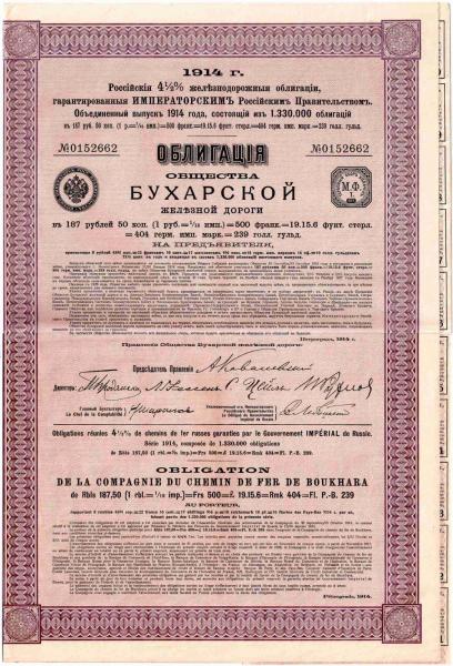 Un'obbligazione emessa nel 1914 dalla Compagnia Ferroviaria di Bukhara. Tutt'altro stile, roba stampata in Russia. Non é annullata, e dietro c'é il timbro della Societé Générale. Che pero' é riuscita ad incassare (o quanto meno a staccare..) solo 9 cedole sulle 40 previste. L'ultima nell'agosto 1918.